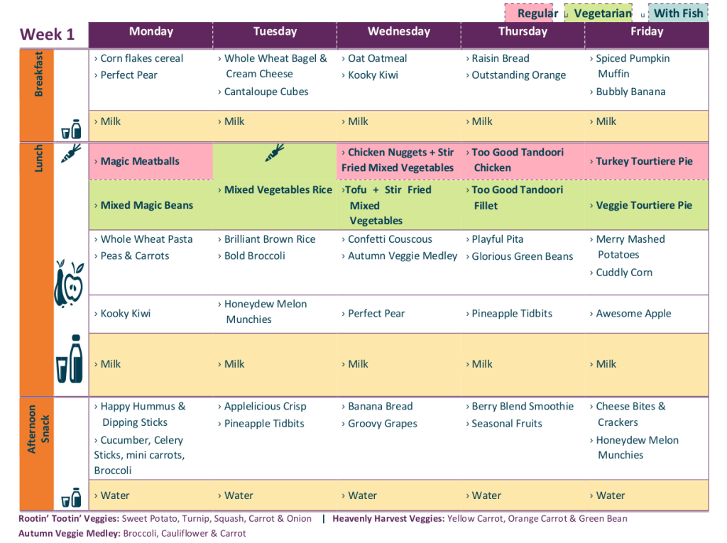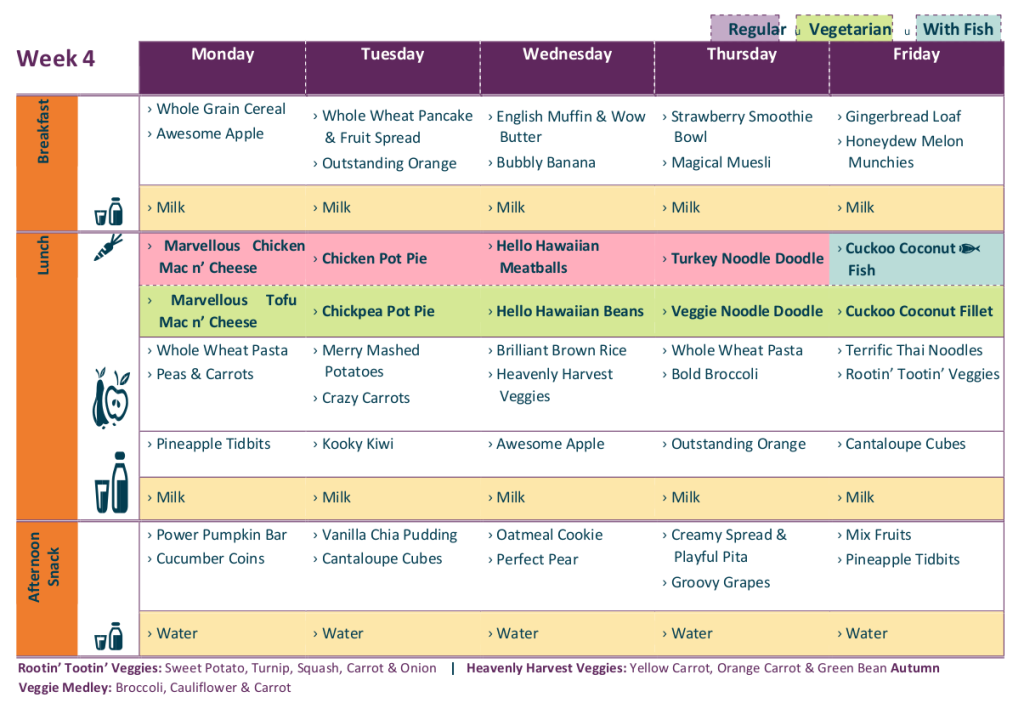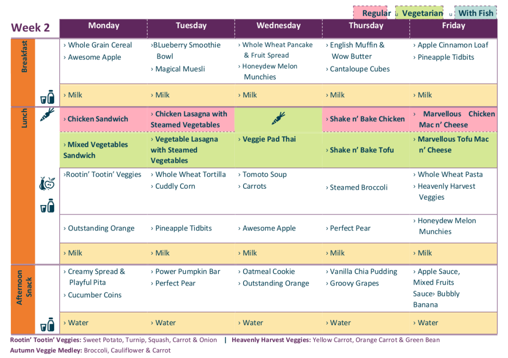 • Lunch: Enjoy hot, balanced meals like Chicken or Tofu Mac n’ Cheese, Sassy Chicken or Tofu Pasta, or fish and egg-based dishes, always paired with a colorful selection of vegetables.