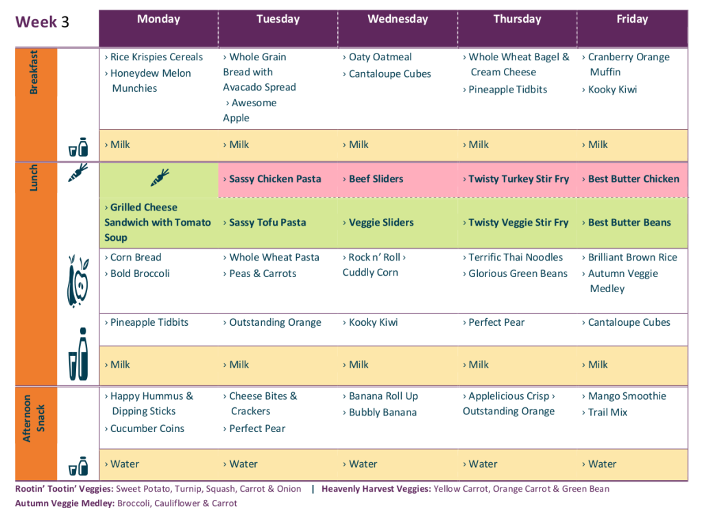 • Snacks: Refuel with fresh fruit, crunchy veggie sticks, creamy yogurt, or homemade baked goods, all served with water or milk.